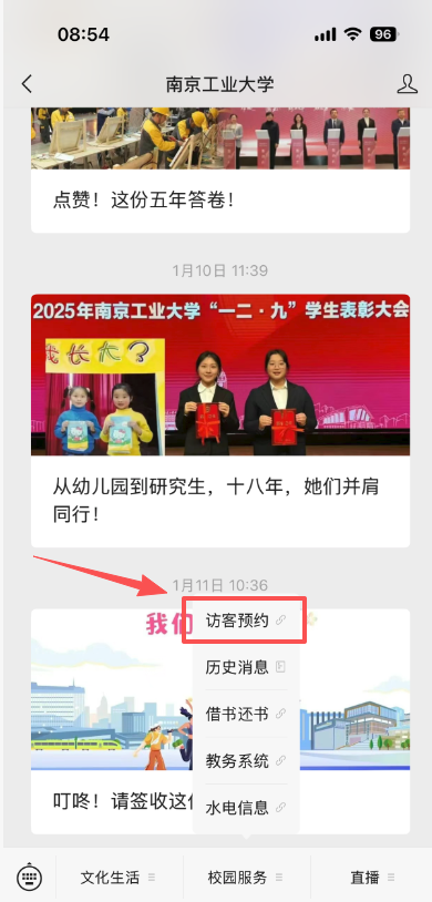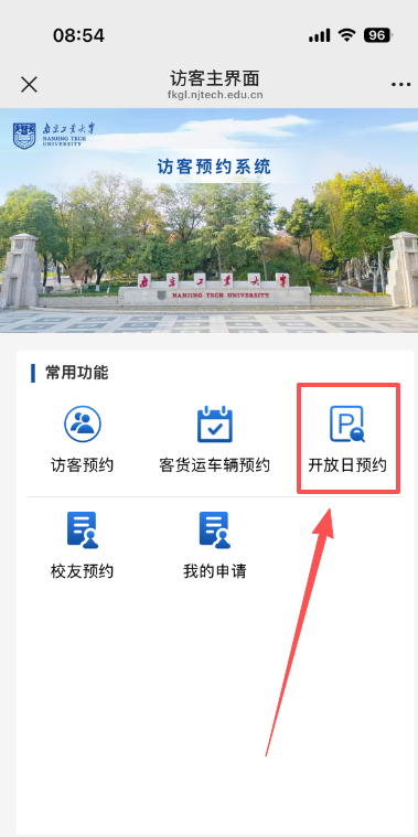 1.线上申请:关注“南京工业大学”微信公众号,点击首页“服务”,选择下方菜单栏“校园服务—访客预约—开放日预约”,填写入校人员信息(含中小学生及陪同家长),按系统提示提交申请。开放日预约功能无需审核,提交成功后即可获得入校资格。