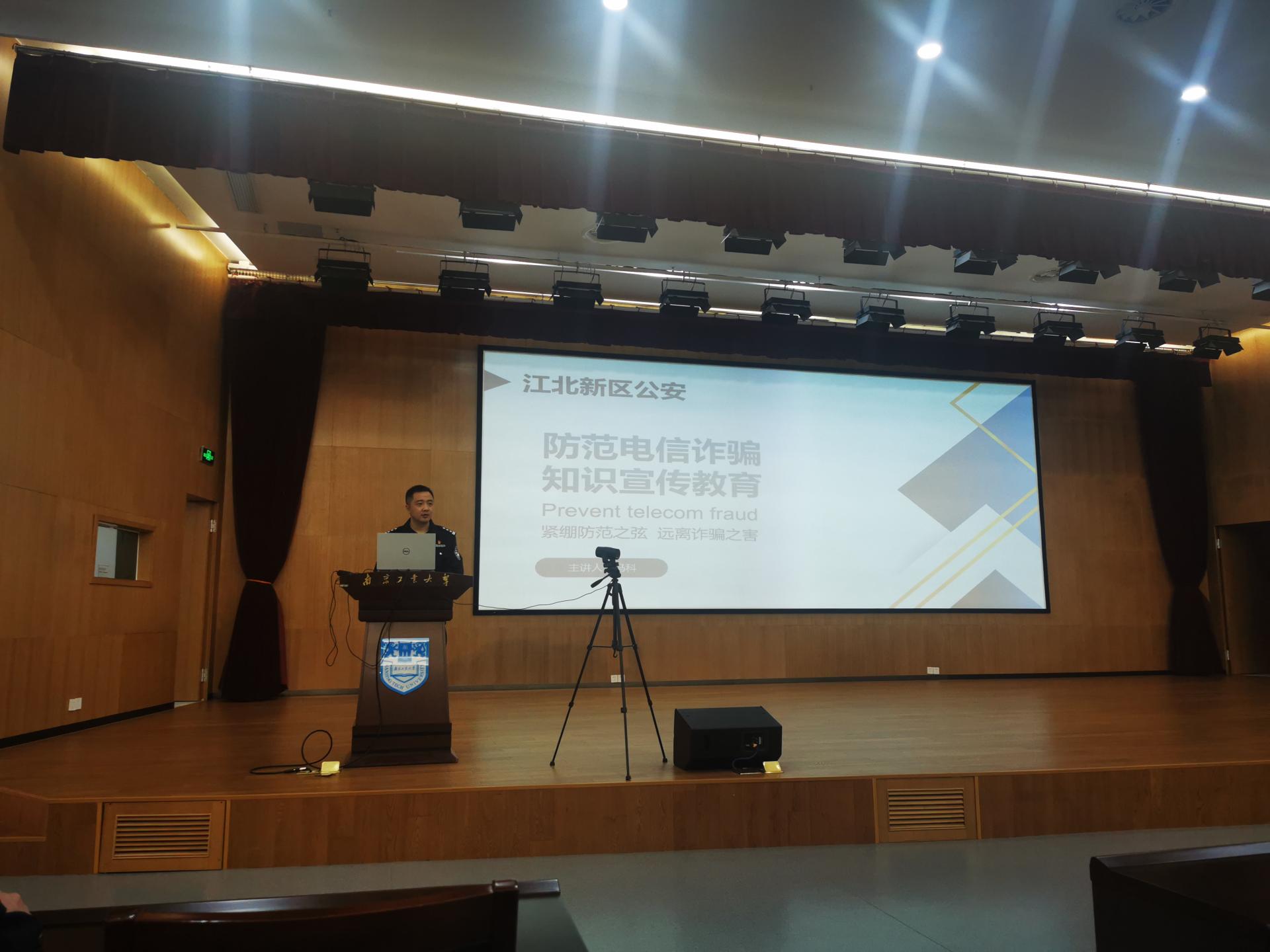 马科警官从电信网络诈骗的定义、江北新区电诈骗案件发案态势、我校常见诈骗类型、防范建议四个方面展开讲解,用一个个鲜活的案例介绍了网络刷单、冒充客服或熟人、游戏交易、网络购物、消除校园贷等常见的诈骗手段。他强调,要时刻保持警惕,保护好个人信息,不轻信陌生人,不下载不明软件,不随便转帐。整场讲座生动、形象,取得了较好的宣传教育效果。