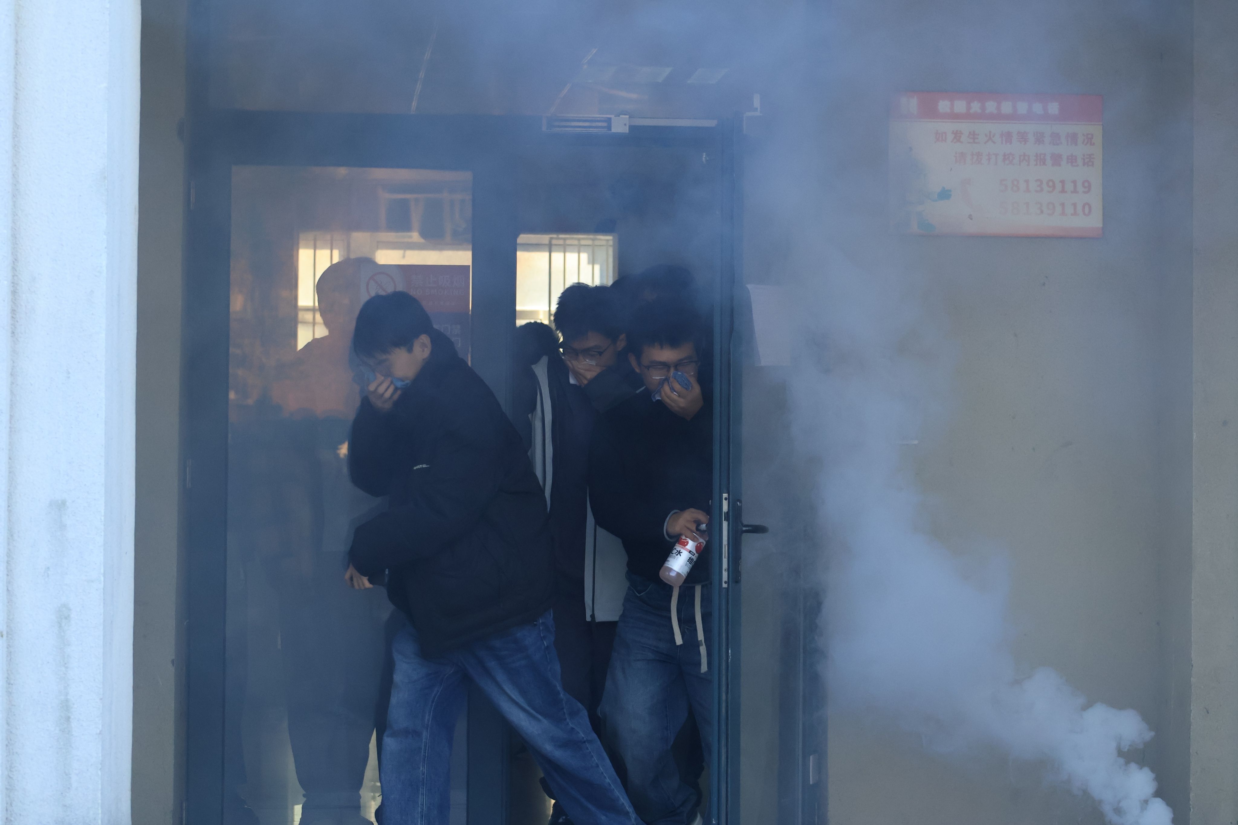 活动伊始,校保卫处张思宇结合校园火灾典型案例,从火灾成因、初期火情识别、逃生路线规划等方面展开讲解,让师生快速掌握基础安全知识。随后,校保卫处工作人员在演练场地打开了发烟罐,模拟“楼道浓烟”场景,参演师生在工作人员引导下弯腰捂鼻,沿墙壁快速有序撤离至指定安全区域。演练尾声,校保卫处工作人员现场演示干粉灭火器“提、拔、握、压”操作要领,师生轮流上手实操,亲手扑灭模拟火源,在实践中掌握灭火技能。