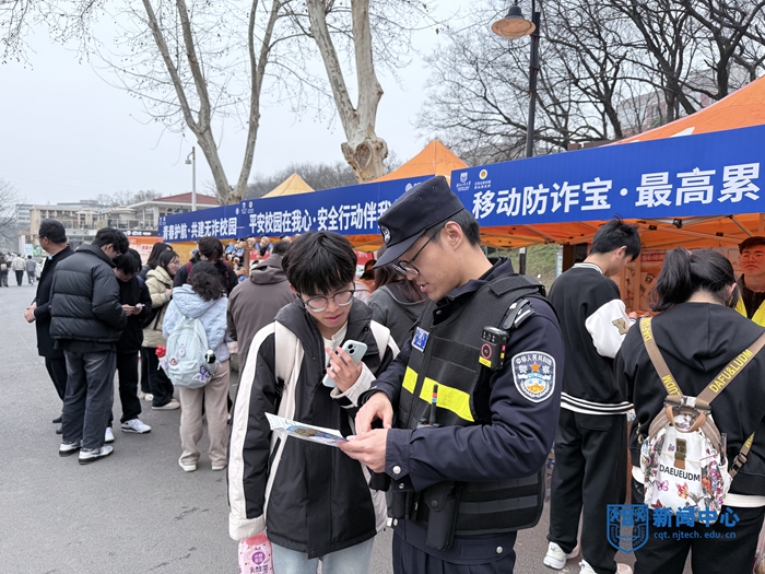 为切实提升师生员工反诈防骗意识,落实2026 年“反电诈宣传月”活动要求,3月20日,保卫处联合顶山派出所、中国移动浦口分公司和校大学生校园护卫队在象山苑学生社区开展反电诈宣传教育活动。校园警务室民警张峰林,保卫处处长蒋远喜、副处长徐东、李智、王利青等参加活动,活动吸引600余人参与。